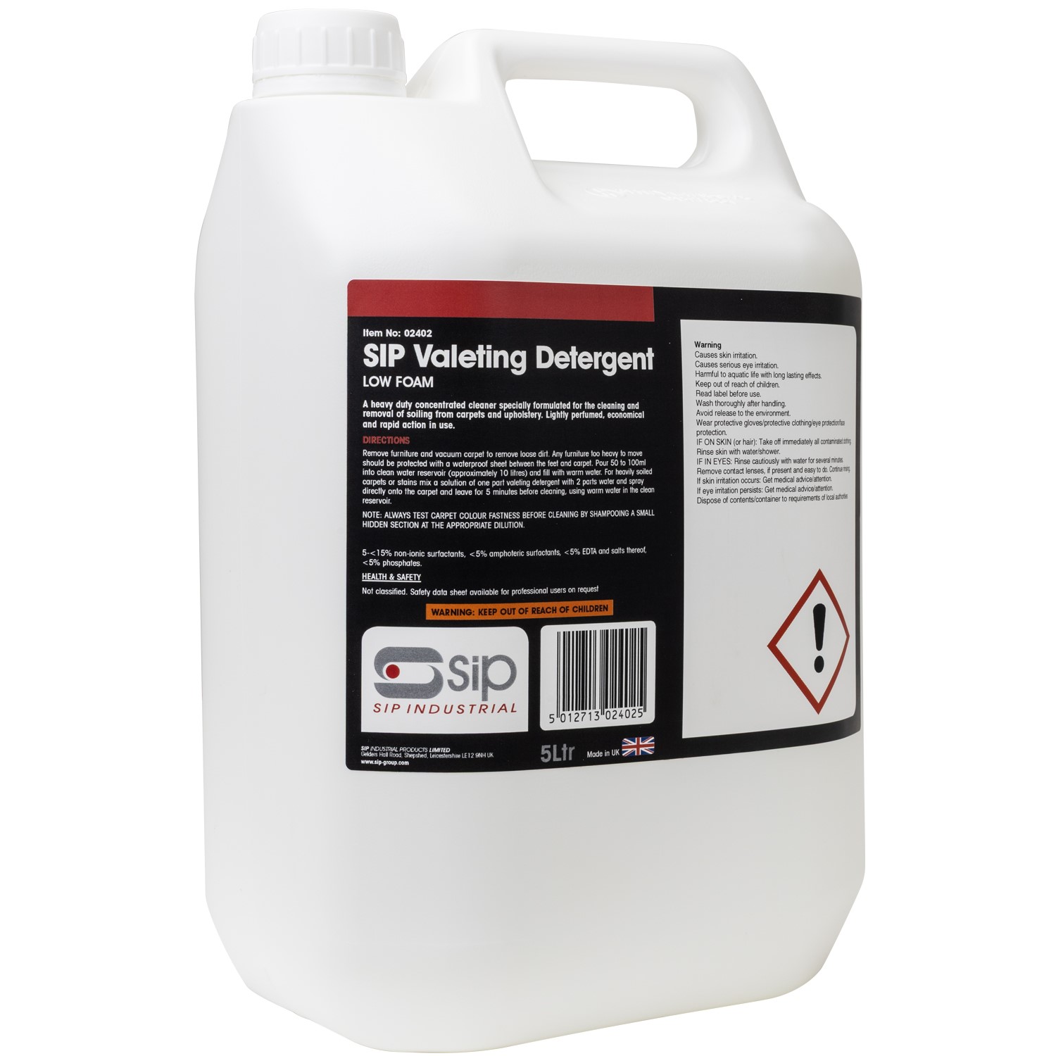 The SIP 5ltr Valeting Detergent is a high-quality and low-foaming concentrated cleaner ideal for SIP Valeting Machines, and perfect for use in the most cleaning applications, with particular emphasis on removal of soiling from carpets and upholstery.