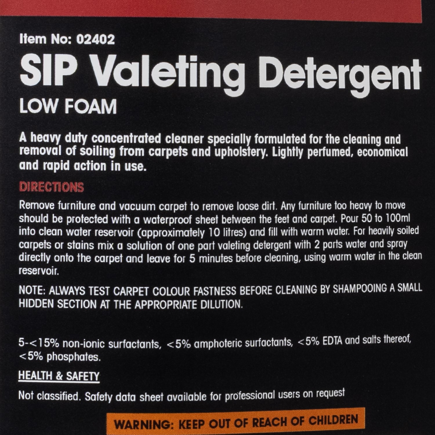 The SIP 5ltr Valeting Detergent is a high-quality and low-foaming concentrated cleaner perfect for use in the most types of cleaning applications, with particular emphasis on removal of stubborn soiling from carpets, fabrics, and upholstery.
