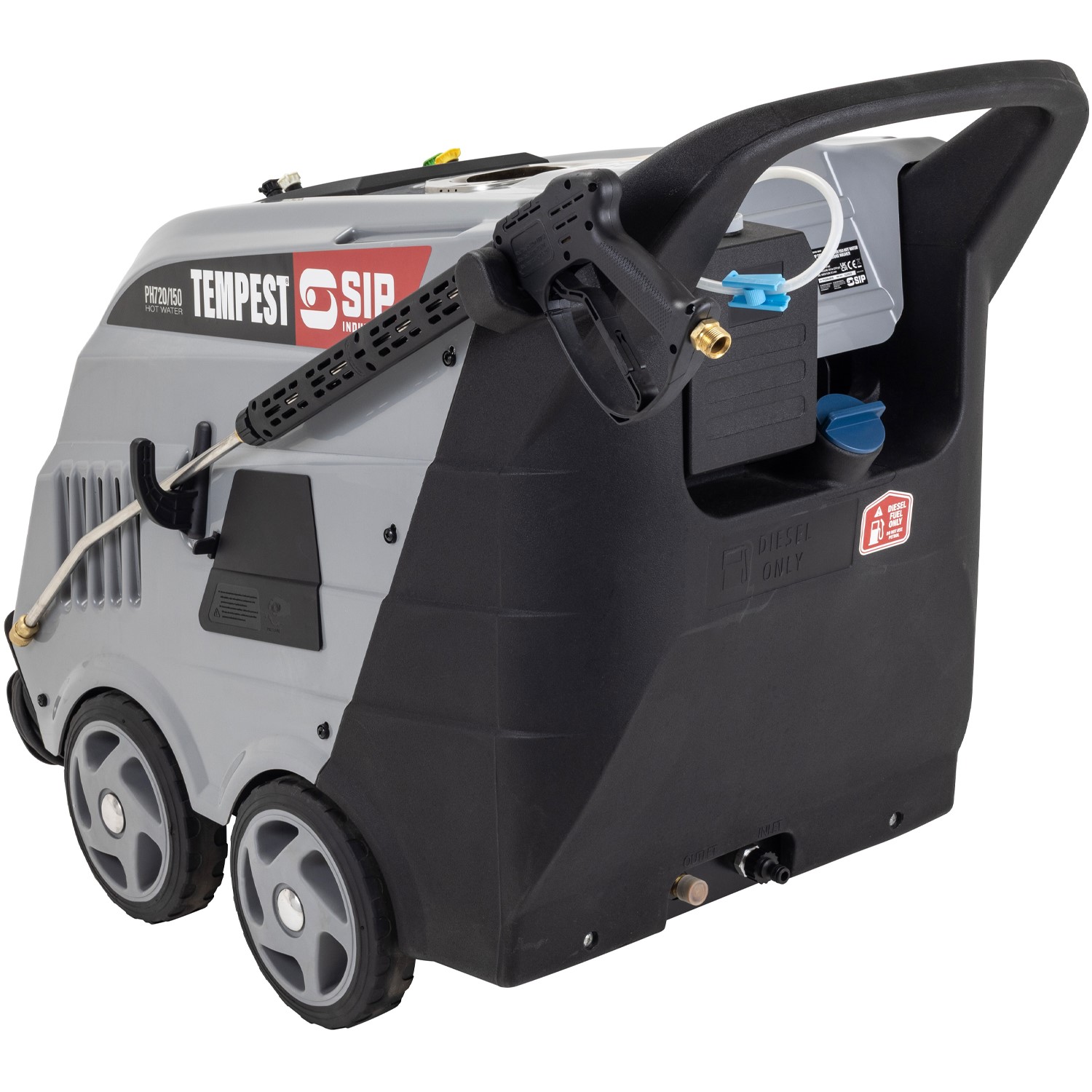 What's in the box?: 1x SIP TEMPEST® PH720/150 Hot Water Electric Pressure Washer, 10m high pressure hose, lance, inlet filter, 4x nozzles, quick coupler, fixings and antifreeze kit.