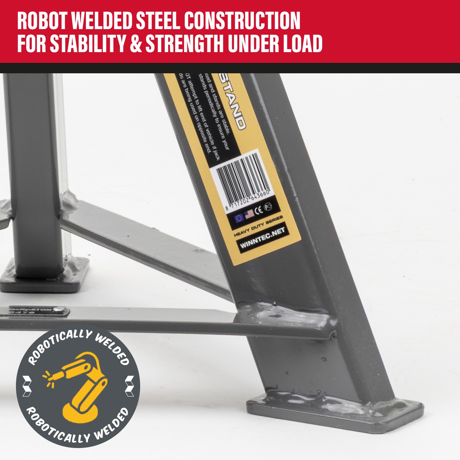Designed for maximum stability, each stand has a robust design and are equipped with a durable polyurethane (PU) saddle pad. They also feature a solid bar pin design with 6 height adjustable positions to ensure safety and stability under load.
